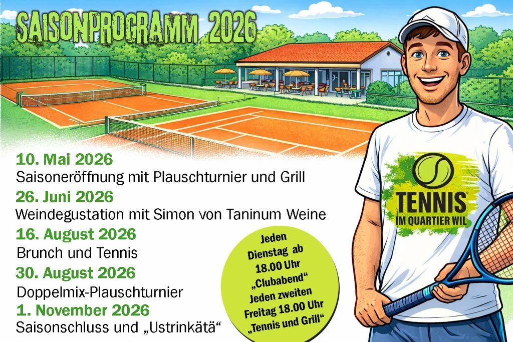Tennis im Quartier (TiQ) Wil bietet allen Tennisinteressierten interessante Möglichkeiten den Sport in geselliger und familiärer Ambiente zu betreiben. Mehr dazu findest du unter den verschiedenen Themenbereichen auf dieser Homepage. Wir befinden uns 2026 im 5. Betriebsjahr und freuen uns auf eine tolle und gesellige Tennissaison auf dem Scheibenberg in mitten der Stadt Wil.